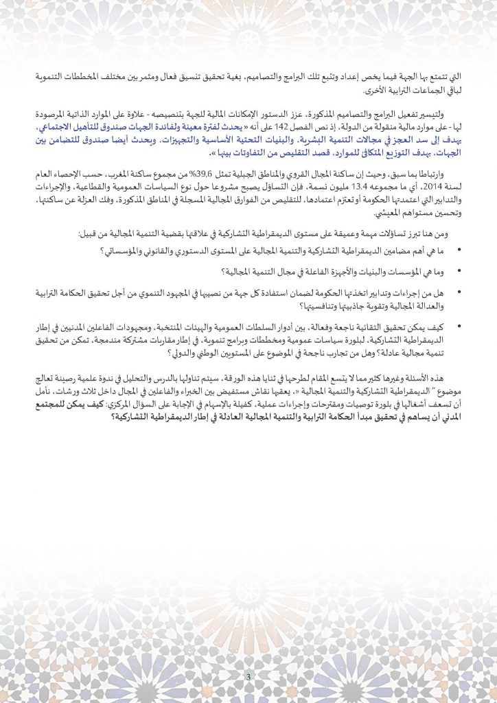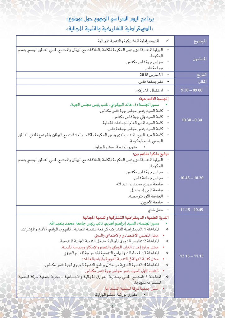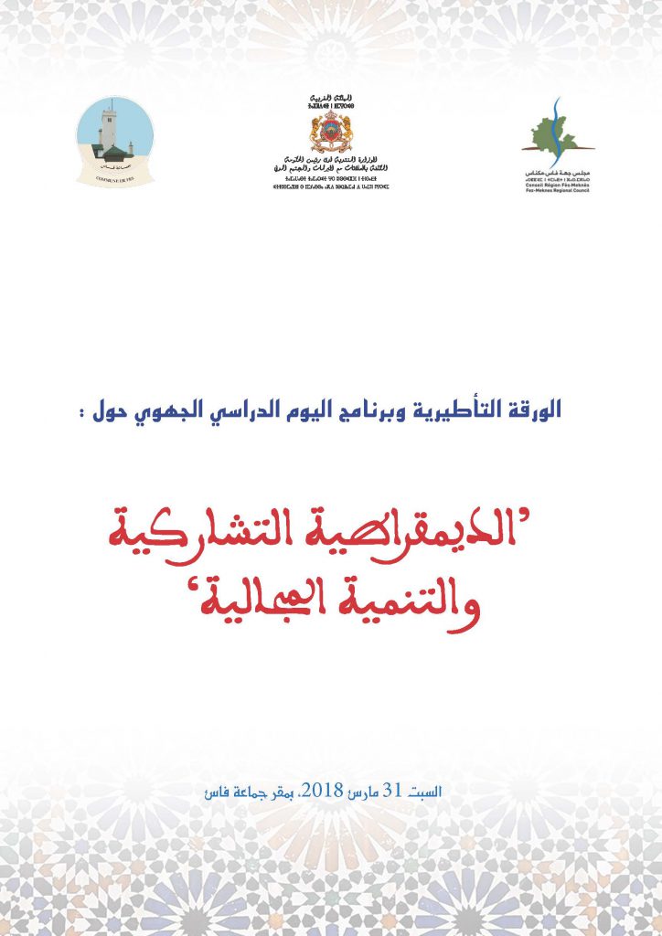 Le conseil régional de Fès-Meknès, la commune de Fès et le ministère chargé des relations avec le parlement et la société civile, organiseront une journée d’étude régionale sur le thème : « démocratie participative et développement territorial », le 31 mars 2018 au siège de la commune de Fès.